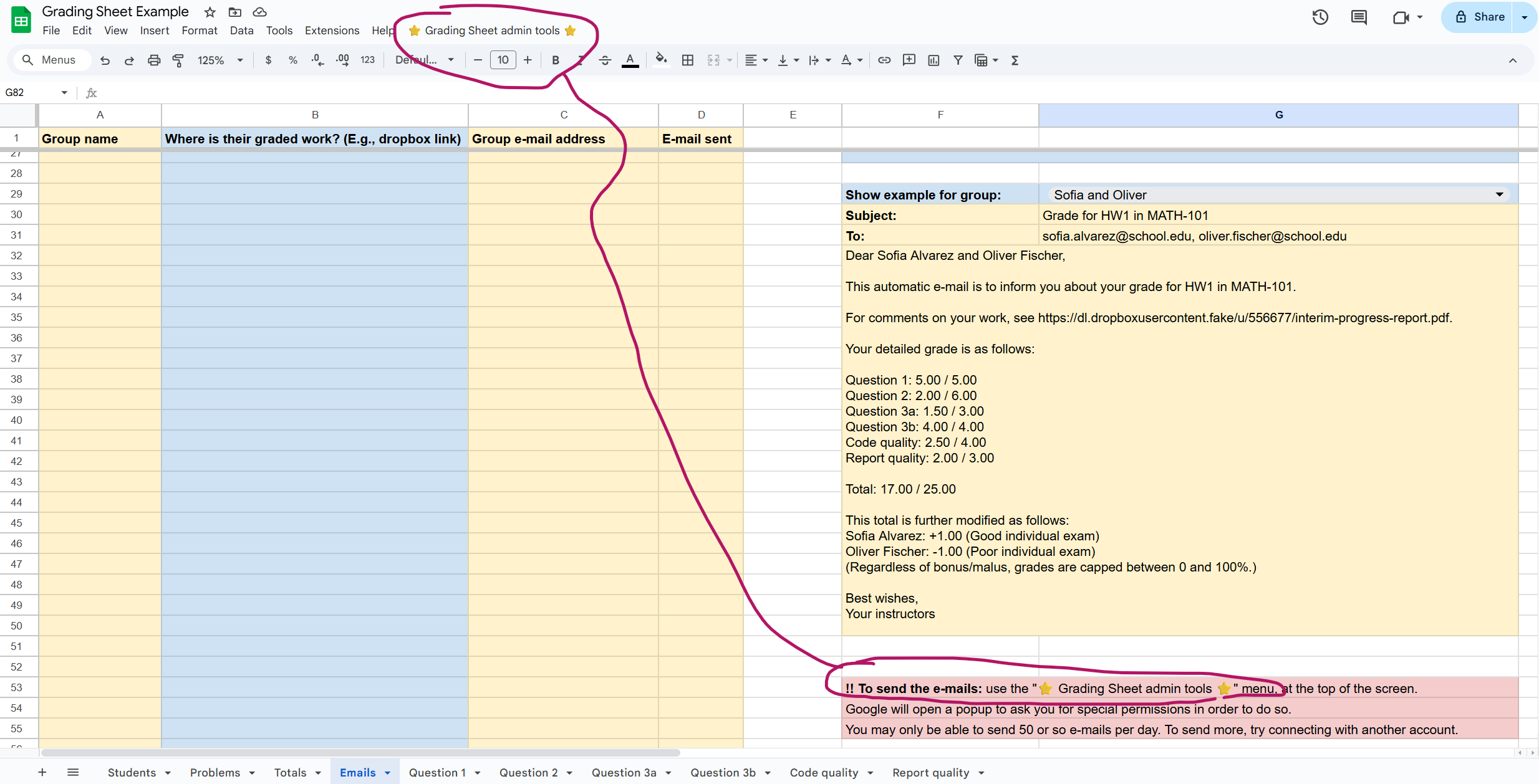 - If an issue with the grading occurs after the fact, it’s easy to make some changes in the sheets and re-send the e-mails.
