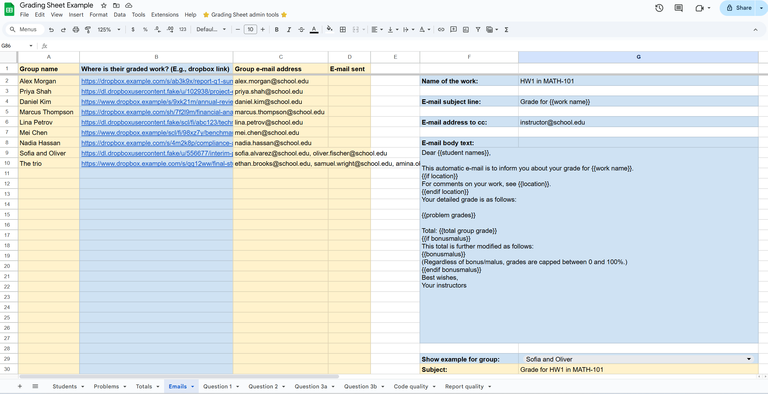 {{student names}}: Lists the names of the / all students in the group (with commas and “and”).{{work name}}: The name of the assignment (see cellG2).{{problem grades}}: Generates a vertical list of every problem and the score achieved (the specific mistakes are not listed).{{total group grade}}: The final calculated score (before bonus/malus).{{location}}: An indication of where to find the work, e.g., a link to the report as a PDF with grader annotations (taken from columnB).{{bonusmalus}}: A list of students who received an individual bonus or malus, with associated details (taken from theStudentssheet).