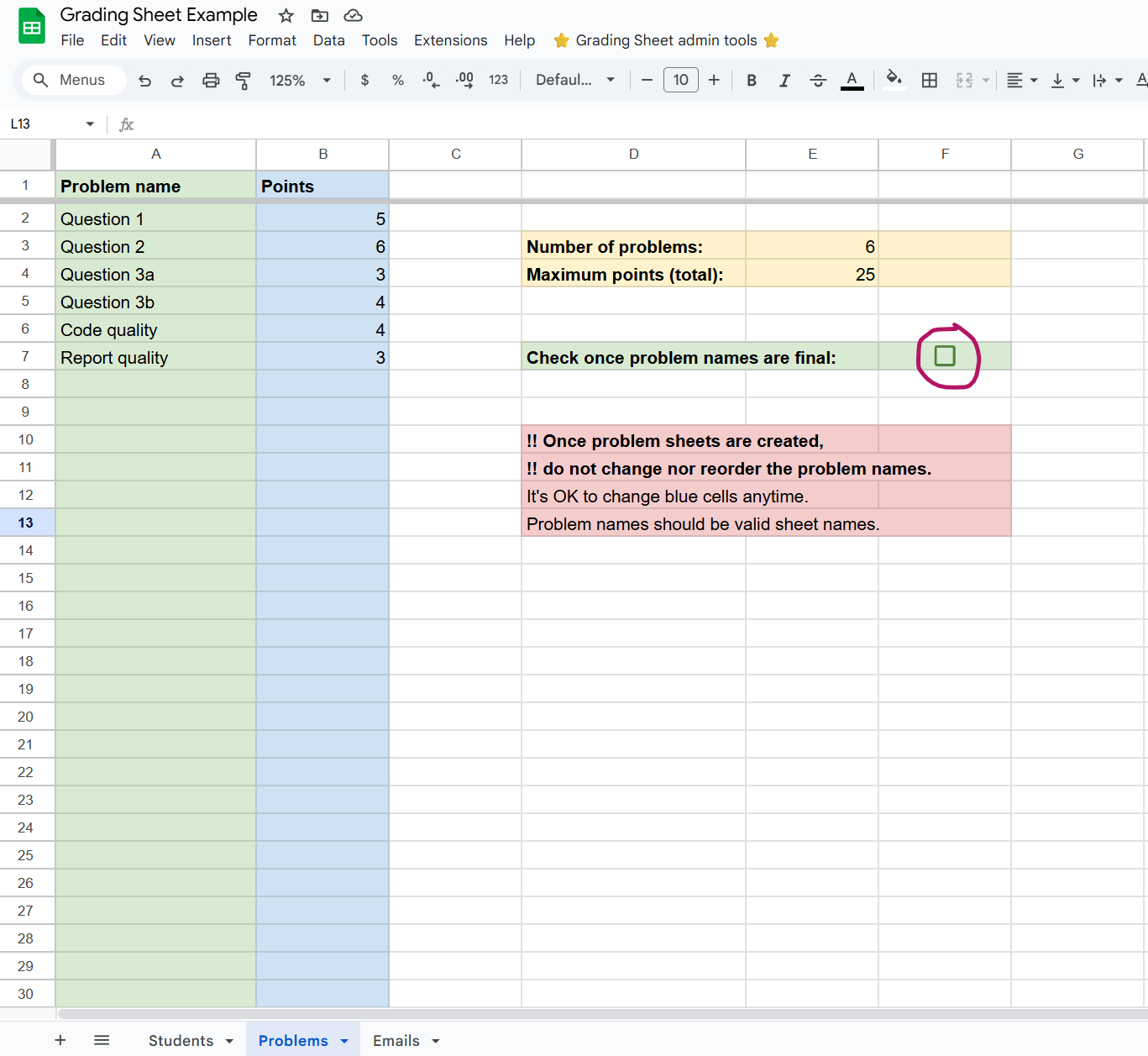 The second thing to do is to list the problems / questions / grading categories in the Problems sheet.