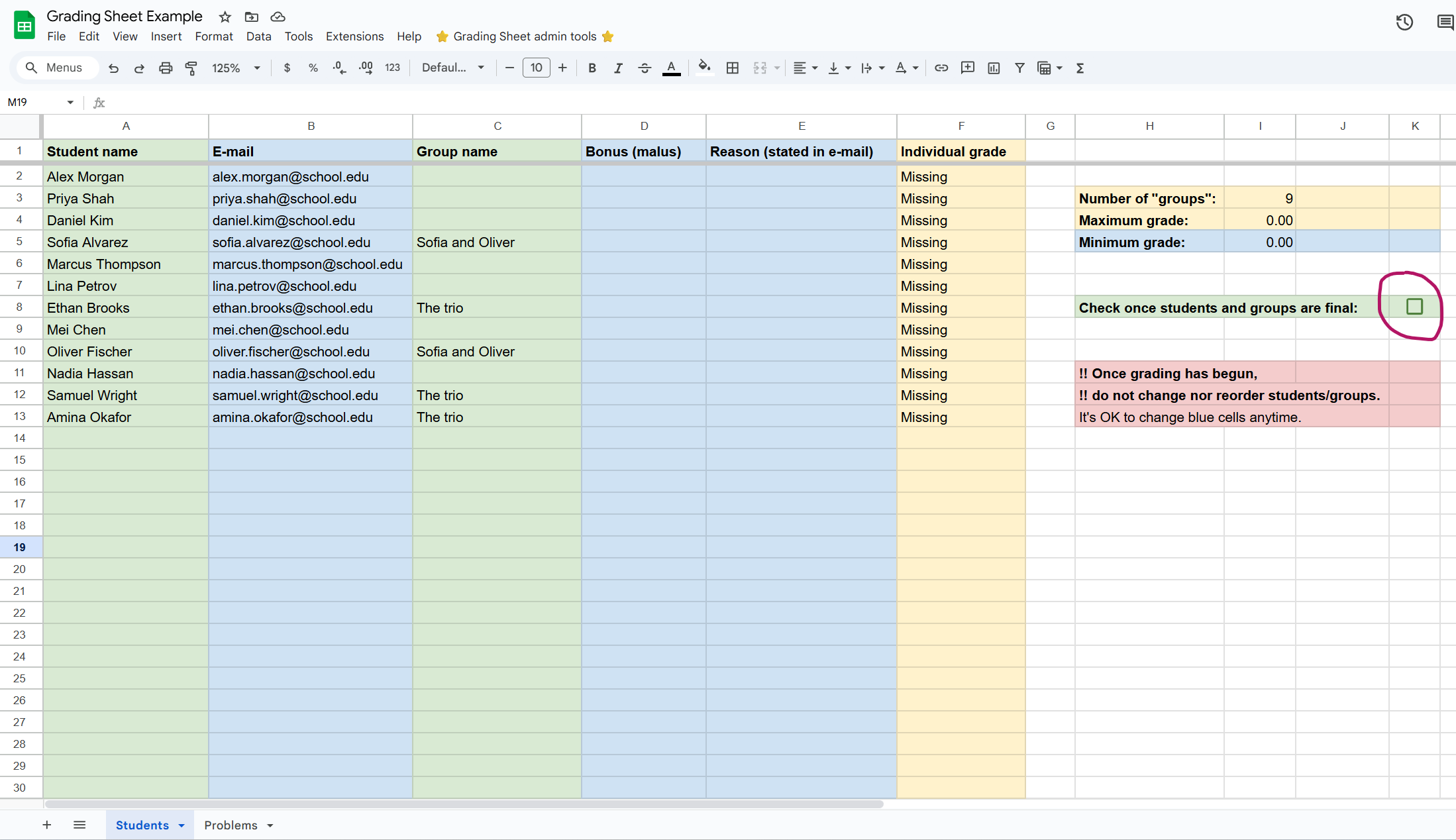Checking the box freezes the students/groups: it’s still ok to edit typos, but group compositions and student ordering should be kept fixed.