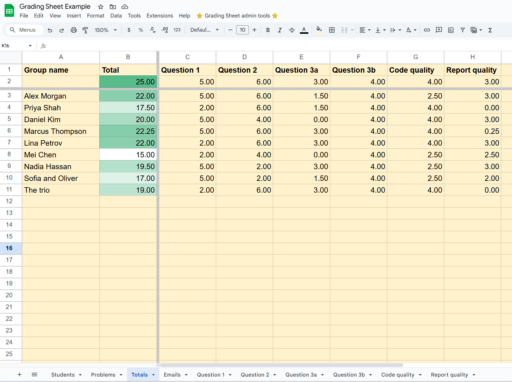 Go to the Totals sheet to review the overall grades: it’s good to start there for a discussion to fine tune the penalties, revisit the worst reports in case something was amiss, and understand how well the students did overall.